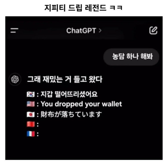챗치피티랑 놀면 잼있어 작성자 정보 마노 작성 124.♡.228.7 아이피 작성일 2025.09.09 15:57 컨텐츠 정보 40 조회 0 추천 0 비추천 목록 본문 심심할때 저도 이것저것 물어보는데 꿀잼인듯! 0 추천 0 비추천 관련자료 이전 헌팅 클럽이나 포차 작성일 2025.09.10 16:56 다음 남자들은 왜이런건지~ 작성일 2025.09.09 15:55 댓글 0 등록된 댓글이 없습니다. 로그인한 회원만 댓글 등록이 가능합니다. 목록