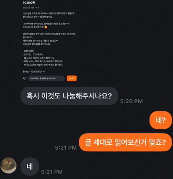당근 거지들 많다드니~ 작성자 정보 소프 작성 124.♡.228.7 아이피 작성일 2025.09.16 16:58 컨텐츠 정보 38 조회 0 추천 0 비추천 목록 본문 안쓰는 향수있어서 올렸는데 무려 9마넌 짜리를 나눔??ㅎㅎ 세상에 너무 공짜 좋아하는 분들많은듯! 0 추천 0 비추천 관련자료 이전 요즘 금값이 70마넌 간다는데 작성일 2025.09.17 16:59 다음 월세 수입의 어느정도 까지 작성일 2025.09.15 16:56 댓글 0 등록된 댓글이 없습니다. 로그인한 회원만 댓글 등록이 가능합니다. 목록